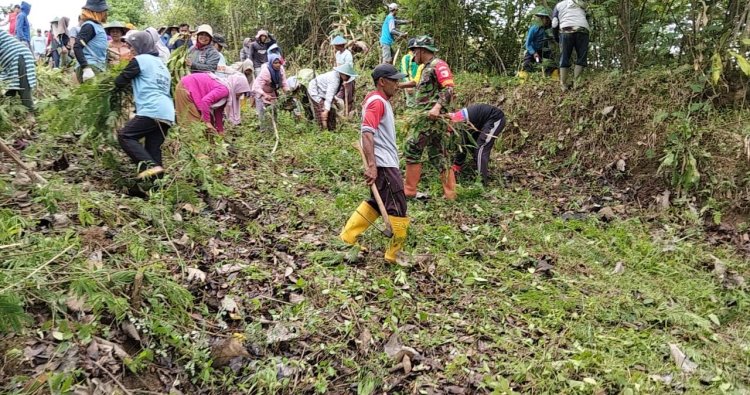 Magetan. - Babinsa Koramil Tipe B/02 Plaosan Serka Sugito bersama warga binaan bergotong royong melaksanakan pembersihan Ruas kanan kiri jalan Dengkeng di Dusun Bogosari Desa Bogoarum Kec.Plaosan Kab.Magetan (29/10/2025).