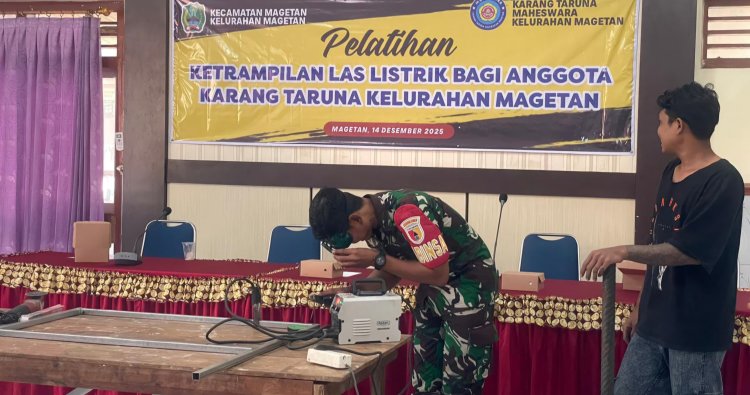 Magetan. - Babinsa Kelurahan Magetan Koramil Tipe B 0804/01 Magetan Kodim 0804 Magetan Serda Deny Sumarsono menghadiri pelaksanaan kegiatan Pelatihan Ketrampilan Las Listrik bagi Karang Taruna Maheswara Kelurahan Magetan bertempat di Balai Kelurahan Magetan, Jalan Merapi, No. 28, Kelurahan Magetan, Kecamatan Magetan Kabupaten Magetan. Rabu (17/12/2025)