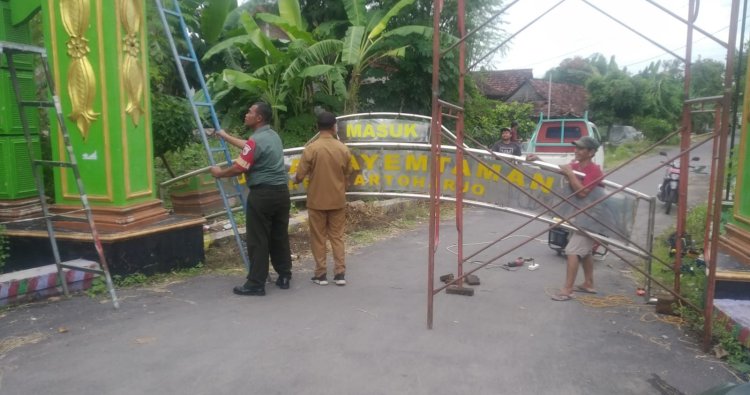 Babinsa Kopka Suroto Bersama dengan aparatur Desa dan warga setempat berkolaborasi dalam proses pemasangan ikon gapura Desa, Gapura yang terawat dan indah akan memberikan kesan positif pada lingkungan Desa serta berkontribusi pada ketertiban visual.