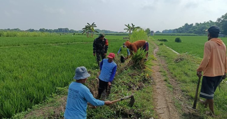 Magetan.- Sertu Hafid Babinsa Desa Setren anggota Koramil 13/ Bendo Jajaran Kodim 0804/Magetan melaksanakan Kegiatan Kerja bakti bersama Kelompok Tani Usaha Tani Makmur Desa Setren membersihkan dan perawatan saluran irigasi dilokasi sawah Pok tani Usaha Tani Makmur Desa Setren kecamatan Bendo Kabupaten Magetan. Kamis, (04/12/2025).