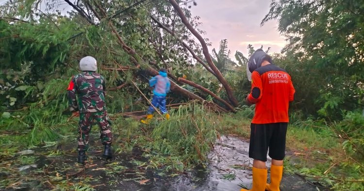 Begitu menerima laporan dari masyarakat, Babinsa Koramil Tipe B 0804/08 Barat Serma Sumadi bersama petugas gabungan dari Polsek, Badan penanggulangan Bencana (BPBD) segera bergerak cepat ke lokasi kejadian. Petugas langsung melakukan evakuasi pohon yang melintang di tengah jalan menggunakan peralatan.