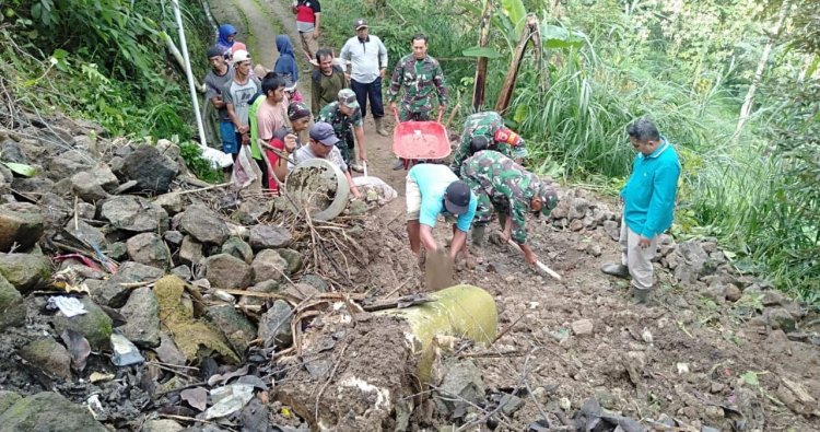 Magetan. - Kapten Cpl Guntur Susilo Danramil 0804/05 Poncol dan anggota Koramil bersama warga masyarakat melaksanakan gotong royong membersihkan jalan dr tumpukan material paska terjadinya tanah longsor tepatnya di Dkh. Keron Ds. Plangkrongan Kec. Poncol Kab. Magetan Senin (16/02/2026).