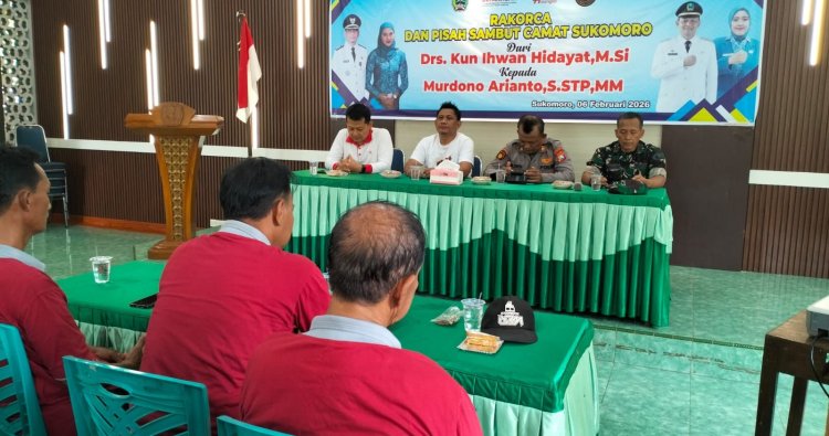 Magetan. - Danramil 0804/09 Sukomoro Kodim 0804/Magetan Kapten Arh Ismani menghadiri kegiatan Rapat Koordinasi Kecamatan (Rakorca) yang dirangkai dengan acara pisah sambut Camat Kecamatan Sukomoro. Kegiatan tersebut dilaksanakan di Balai Pertemuan Kecamatan Sukomoro Kabupaten Magetan dan dihadiri kurang lebih 100 peserta dari unsur Forkopimca, kepala desa, tamu undangan lainnya.Sabtu (07/02/26).