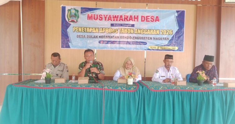 Magetan.– Danramil 0804/13 Bendo, Kapten Inf Arif Wibowo bersama Forkopimca hadiri kegiatan Penetapan Anggaran Pendapatan dan Belanja Desa (APBDes) Tahun 2026 yang dilaksanakan di Pendopo "Guno Mulyo Balai Desa Bulak, Kecamatan Bendo, Kabupaten Magetan.Rabu (31/12/25)