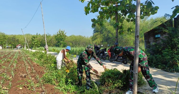 Di tengah cuaca pagi yang bersahabat, personel Satgas TMMD ke-126 Kodim 0804/Magetan bersama warga setempat bahu-membahu membersihkan rumput liar di saluran irigasi pertanian.